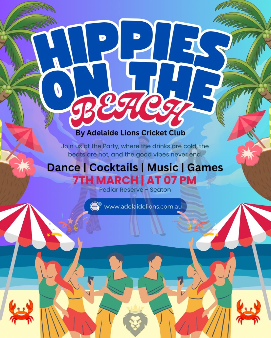 Get ready to turn up the good vibes as Adelaide Lions Cricket Club brings you a night of peace, love, and beachside madness! 🌊✌️